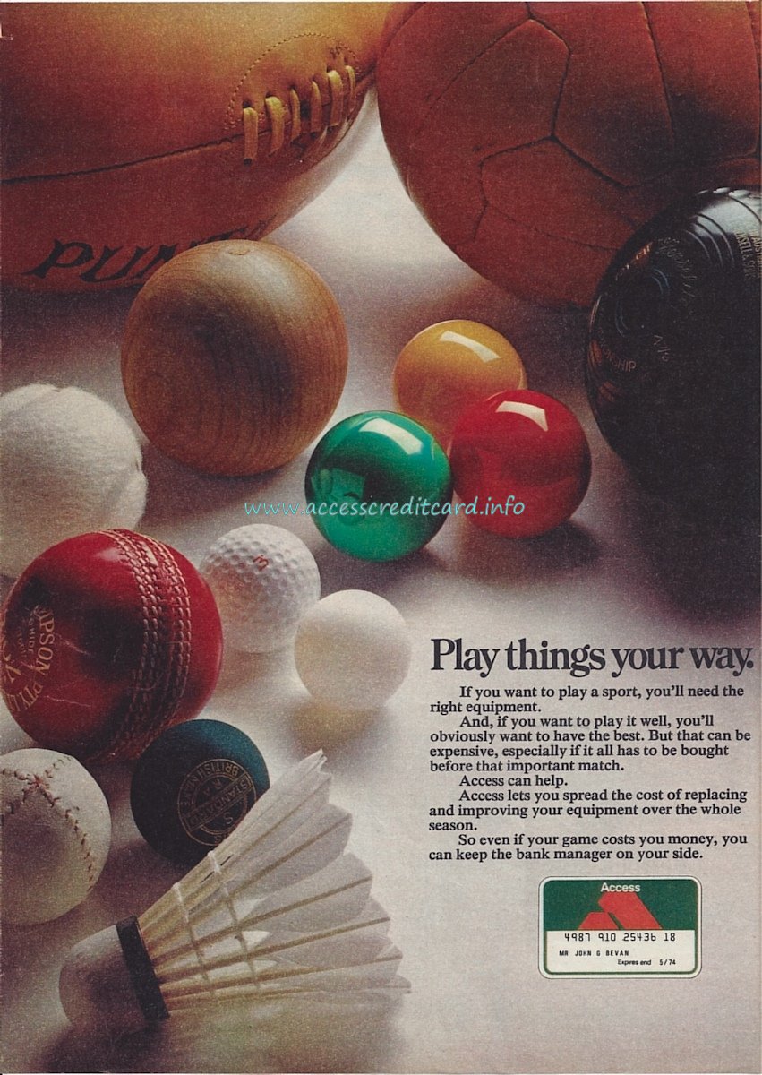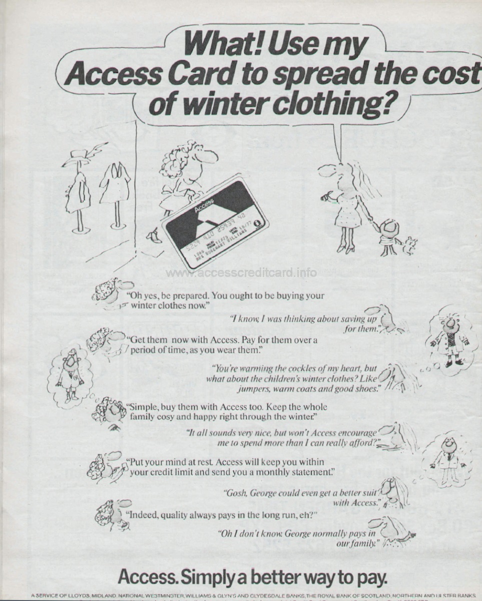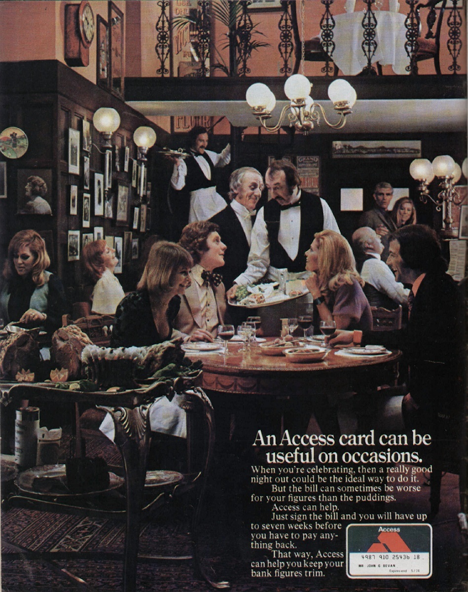 Note that the card number on the Access card adverts now starts 5224, rather than 4987. This indicates a switch to a MasterCard (then "Master Charge: The Interbank Card") numbering scheme, long before the MasterCard symbol started to appear on the cards.